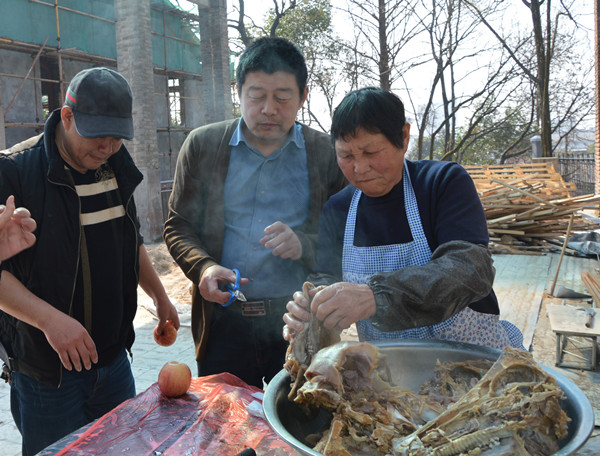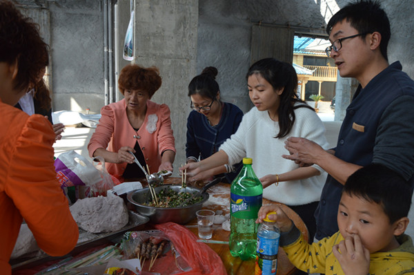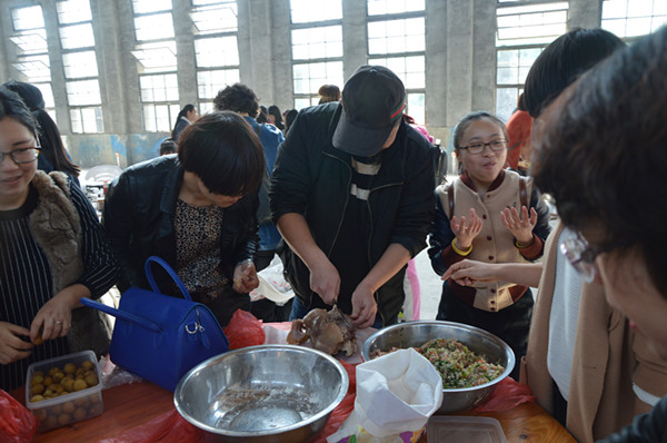 這邊包餃子的問題正討論的激烈,那邊熱氣騰騰的豬頭也出鍋了。“呀,這么大的豬頭,小時(shí)候過(guò)年的感覺”。“對(duì)啊,對(duì)啊,這種氣氛,這種味道,太有紀(jì)念意義了”?!皝?lái)來(lái)來(lái),我拍張照片,微信朋友圈曬一曬”。黃色餃子、綠色餃子、紅色餃子、紫色餃子相繼的出鍋了,燒烤的食品也相繼出爐,大家互相品評(píng),因?yàn)槎际亲约簞?dòng)手參與,一切都變成了美食。