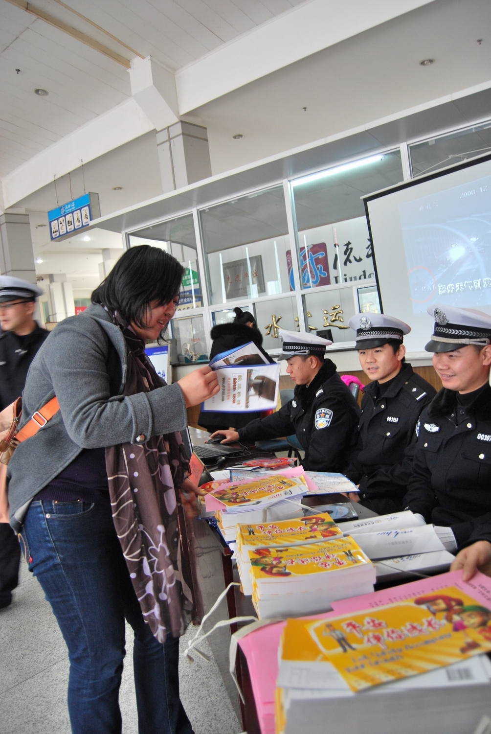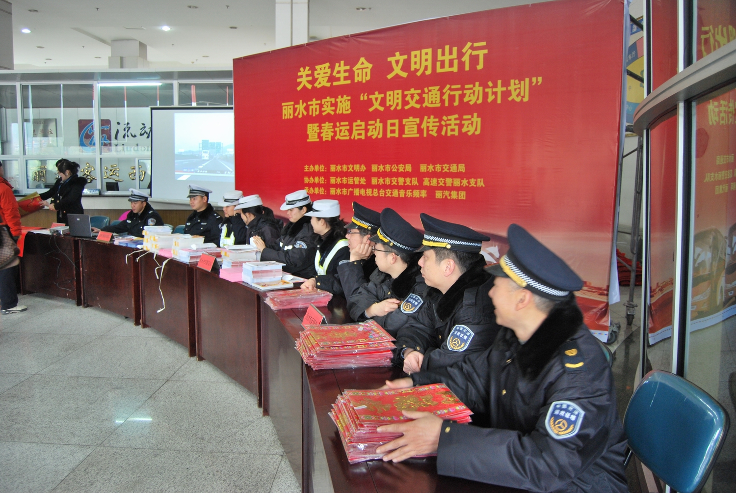 此次活動以“關(guān)愛生命、文明出行”為主題,交警部門準備了《平安伴你成長》、《道路交通事故警示錄》、《浙江省高速公路指南》等圖冊進行發(fā)放,市交警隊的同志特意將《關(guān)愛生命、文明出行--全國實施“文明交通行動計劃”倡議書》送到候車旅客手中,市運管處、交通音樂頻道、高速交警支隊還進行了春聯(lián)、“?!弊趾推桨卜F(xiàn)場贈送,向過往旅客送出新年祝福。