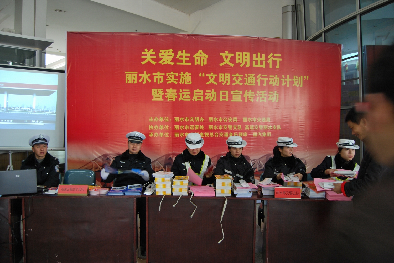 春運首日,由麗水市文明辦、麗水市公安局、麗水市交通局主辦,麗水市運管處、麗水市交警支隊、高速交警麗水支隊協(xié)辦,麗水電臺交通音樂頻率、麗汽集團承辦的 關(guān)愛生命 文明出行 麗水市實施“文明交通行動計劃”暨春運啟動日宣傳活動在麗水客運西站舉行。