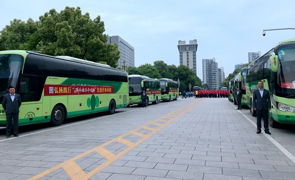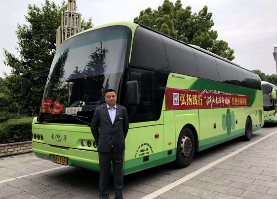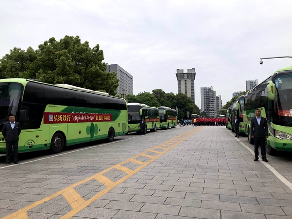 4月19日早上,在市政府南門廣場,麗汽集團(tuán)旅游汽車分公司16輛綠色豪華大巴齊刷刷地排列著,16位駕駛員統(tǒng)一著裝,整齊劃一地站在車門迎候游客。這是2019年麗水市弘揚(yáng)踐行“浙西南革命精神”系列活動(dòng)啟動(dòng)儀式暨勞模、一線(優(yōu)秀)職工紅色療休養(yǎng)活動(dòng)發(fā)團(tuán)儀式的現(xiàn)場。綠色大巴與著紅色服裝的先進(jìn)相互映襯,形成了“紅+綠”融合發(fā)展的場景,和諧的畫面吸引了在場人員的關(guān)注,紛紛拿出手機(jī)拍場景,曬朋友圈。