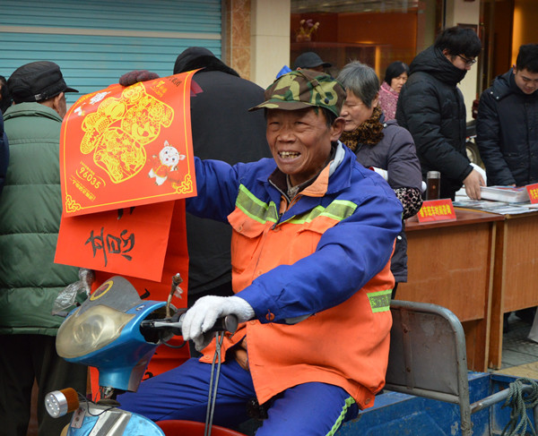 環(huán)衛(wèi)工人接過麗汽集團(tuán)黨員送上的福字和春聯(lián)臉上樂開了花