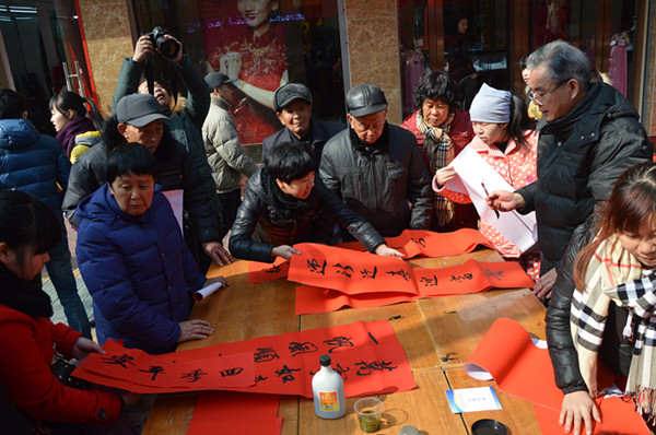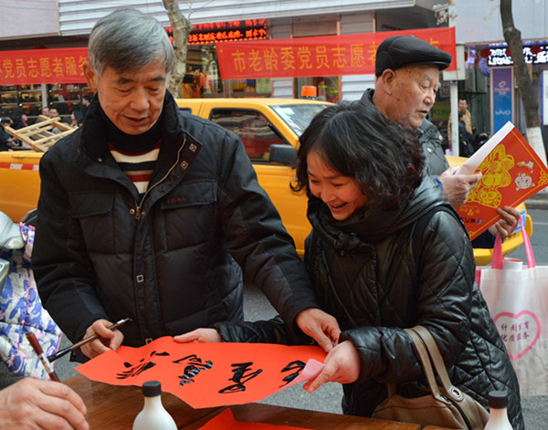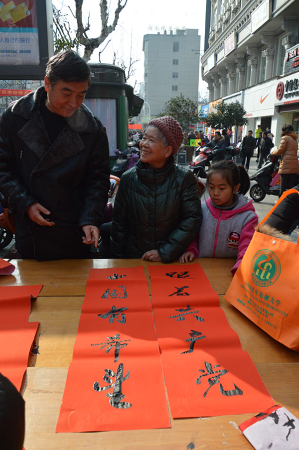 幾張小桌子拼成的簡易書案更是黨員一條街上靚麗的風(fēng)景。三位老同志一落筆,書案旁邊一下子就圍滿了人,大家一邊排隊(duì)等候著“墨寶”,一邊點(diǎn)贊著三位老師的書法。葉女士高興地說:“手寫的春聯(lián)不僅更有年味,而且還是在弘揚(yáng)中國的書法藝術(shù)。中國傳統(tǒng)的年俗文化,現(xiàn)在已經(jīng)越來越難得了?!币粚?duì)雙胞胎寶寶的父母恰巧推著嬰兒車從服務(wù)點(diǎn)前經(jīng)過,趕緊請(qǐng)老師寫下“開心寶貝”四個(gè)字,還說是給孩子倆最珍貴的新年禮物。