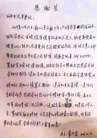 11月18日,東站服務臺收到了乘客章興佳親手送來的一封感謝信,這是一封寫給東站業(yè)務站站長鄭宣偉的感謝信,信中寫到失主章興佳于10月21日從景寧乘車到麗水,不慎將手機遺落在車上,在他發(fā)現手機不見后,抱著僥幸的心里來到服務臺尋求幫助時,業(yè)務站站長鄭宣偉第一時間幫他聯系駕駛員尋找手機的事情。