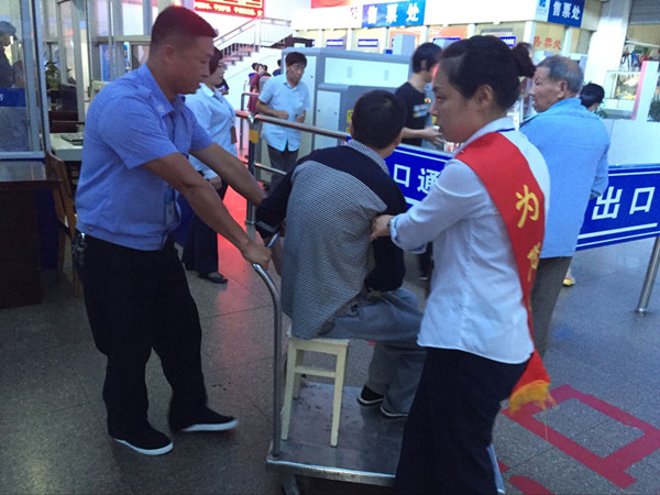 6月14日下午,在客運東站的候車室里,一輛特殊的“輪椅”引起了大家的注意,只見東站副經(jīng)理戴宏星和保衛(wèi)科的熊宣標(biāo)推著由拉貨的行李車和小方凳組成的“輪椅”,余靜雙手扶著坐在“輪椅”上的旅客,他們?nèi)齻€人小心翼翼的護送旅客到檢票口。