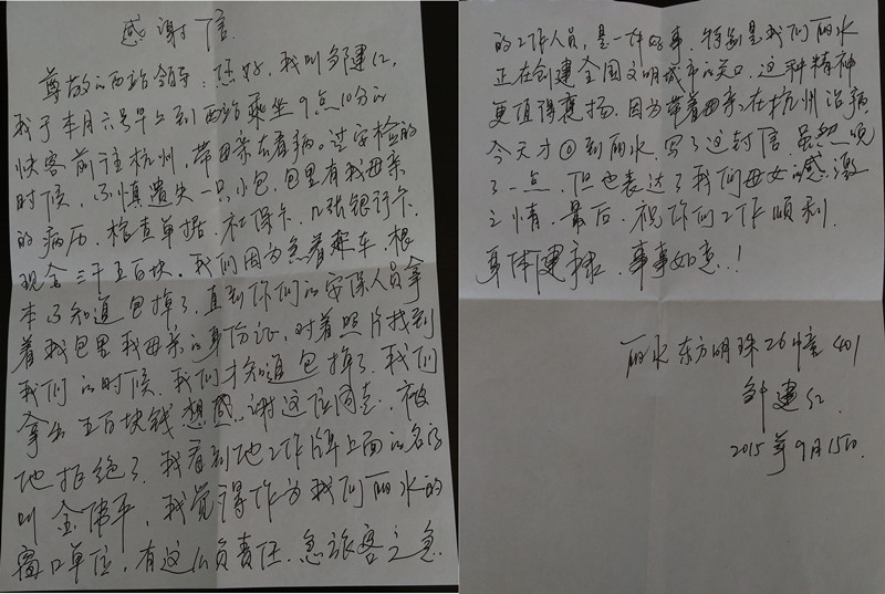 盡快送回“救命錢”,對(duì)金偉平來說,是做好本職工作,但對(duì)鄒女士母女來說,卻也猶如雪中送炭,正如鄒女士在信中寫道,“作為我們麗水的窗口單位(客運(yùn)西站),有這樣負(fù)責(zé)任,急旅客之急的工作人員,是一件好事,特別是我們麗水正在創(chuàng)建全國文明城市的關(guān)口,這種精神更值得表揚(yáng)?!?/p>